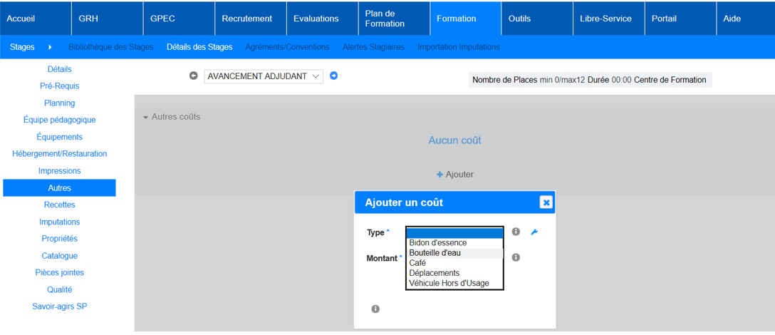 Il est possible de créer des types de dépense dans l’écran de paramétrage « Formation > Divers Formation > Autres frais » (accessible pour les administrateurs via le bouton « clé à molette », à droite du champ), qui pourront ensuite être sélectionnés dans cet écran et associé à un montant.