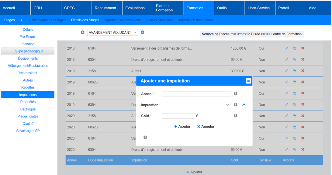 Les imputations renseignées dans le modèle de stage sont présentées ici, mais il est également possible d’en ajouter / supprimer / modifier.