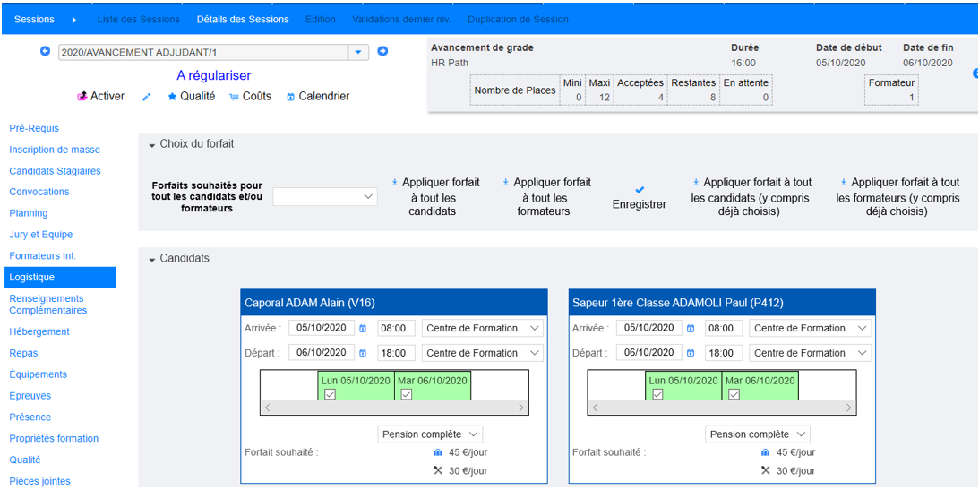 L’onglet Logistique du détail des sessions permet de définir le forfait à appliquer pour chaque participant et ainsi indiquer quelle formule d’hébergement et repas est à prendre en compte pour les stagiaires et formateurs.