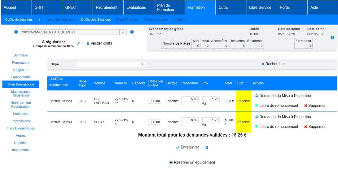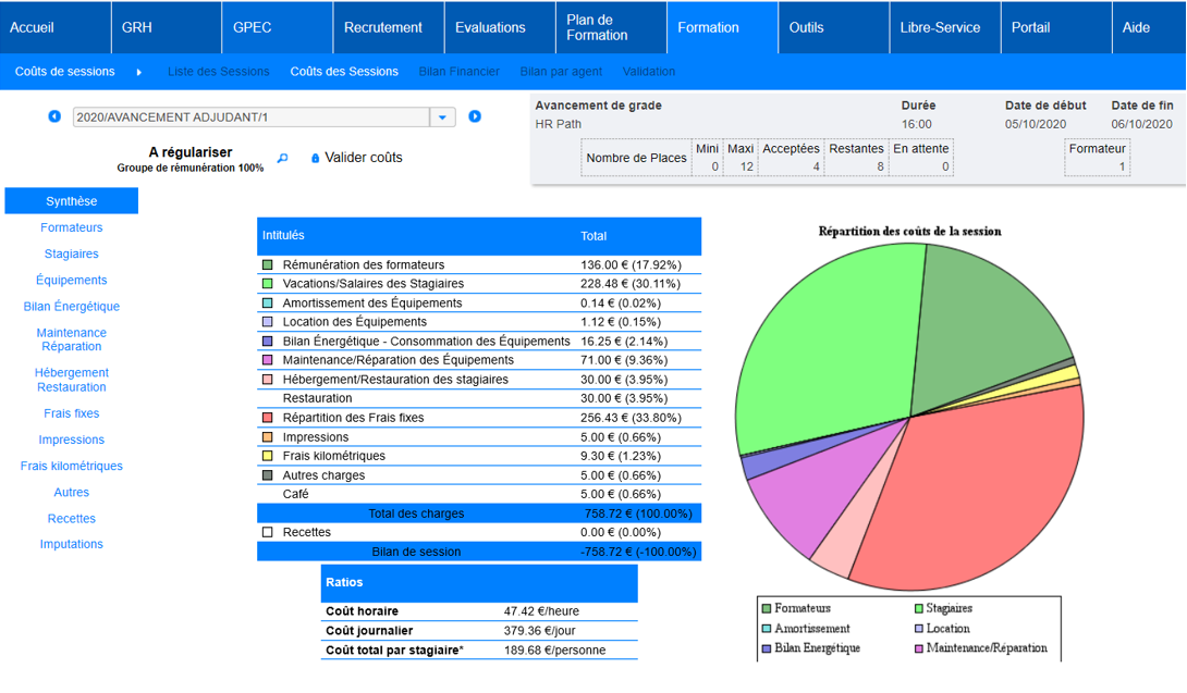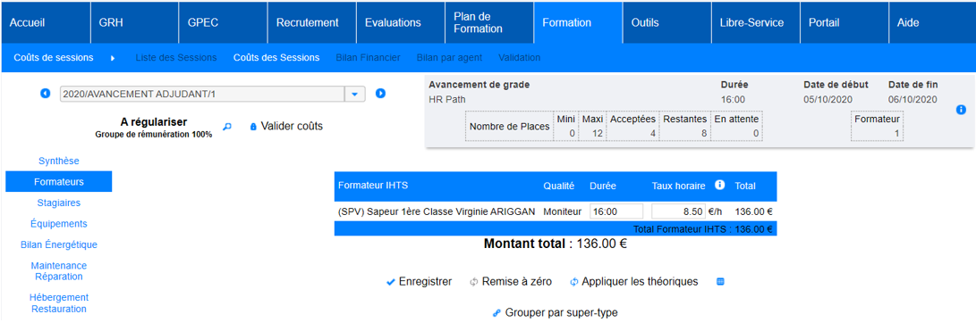 L’écran coûts des sessions est accessible dans « Formation > Coûts des sessions > Coûts des sessions »