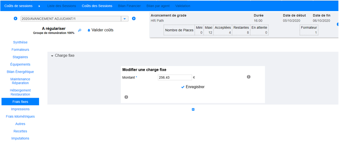 Cet écran permet de créer une charge fixe associée à la session, qui sera également reporté dans l’écran de synthèse.