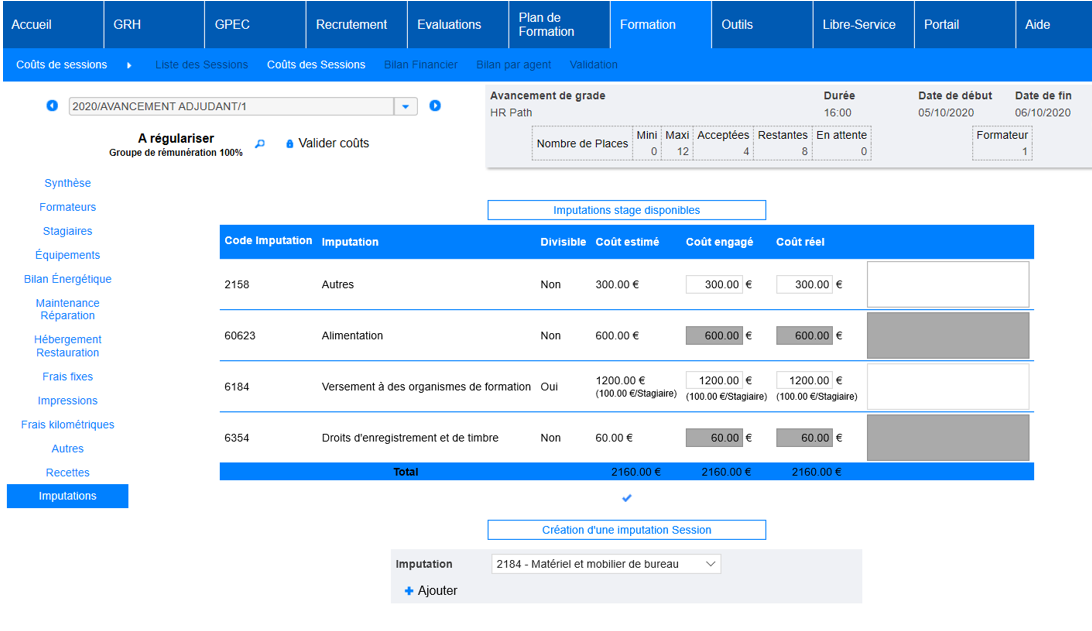 Cet écran permet de gérer les imputations budgétaires de la session. Les coûts précédents étant plutôt une approche « analytique ».