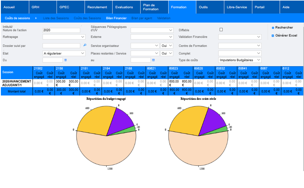Le bilan financier reprend la répartition des coûts des sessions, et permet leur affichage selon plusieurs axes : par stage, année ou séquence pédagogique.