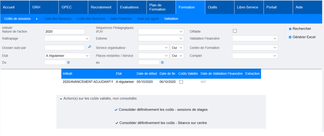 Cet écran permet de valider les coûts des sessions, en cochant la case de la colonne « Coûts validés ».