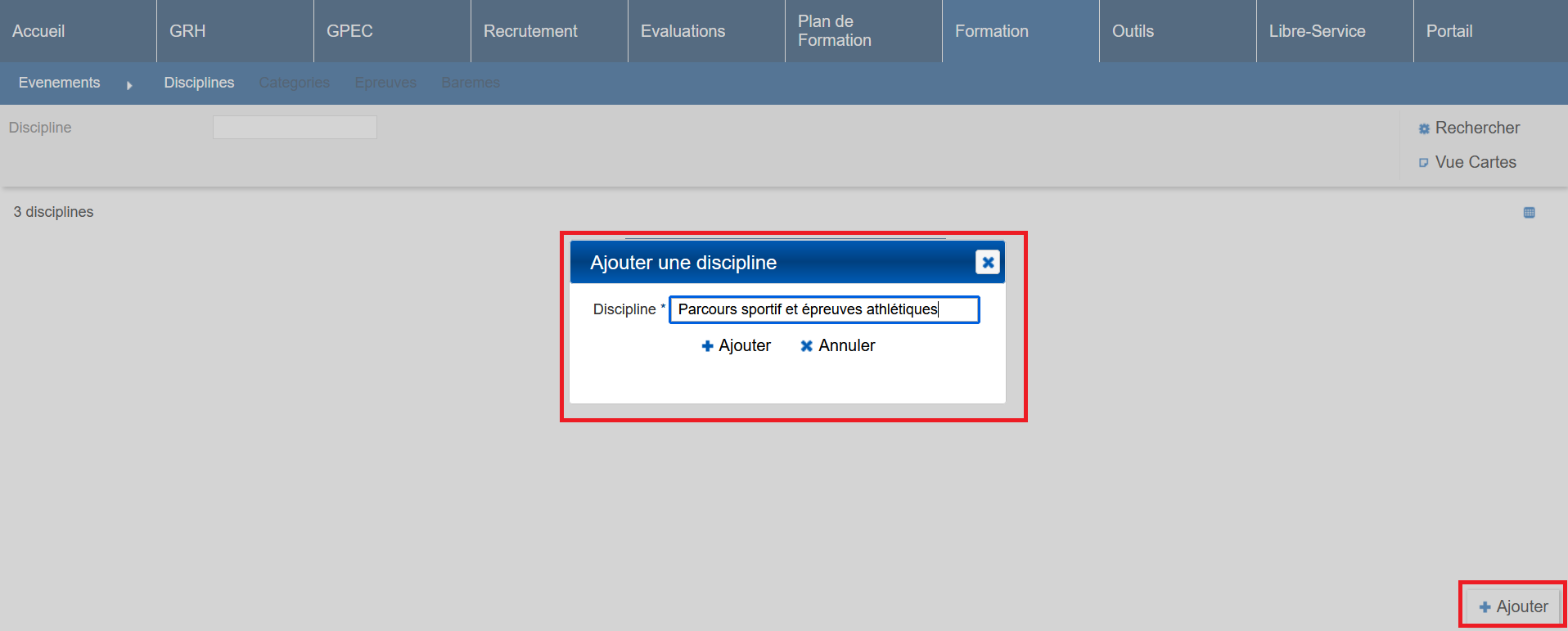 Cliquer sur “Ajouter” en bas à droite de l’écran pour créer une nouvelle discipline.