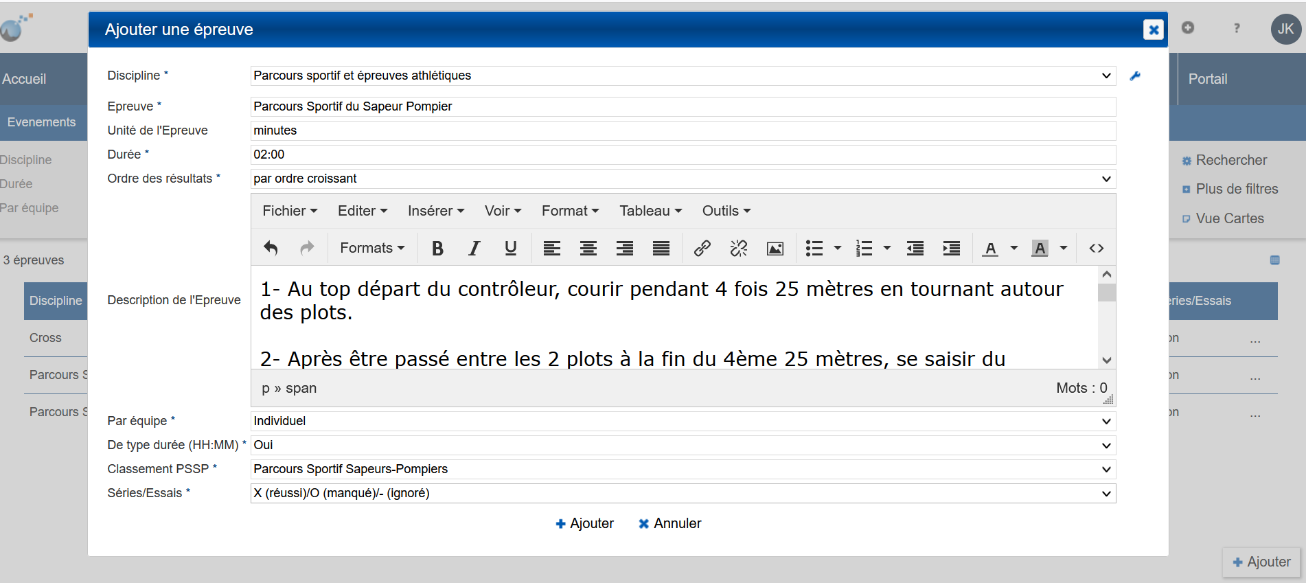 Une fois la discipline créée, il est possible de créer et d’y associer des épreuves.