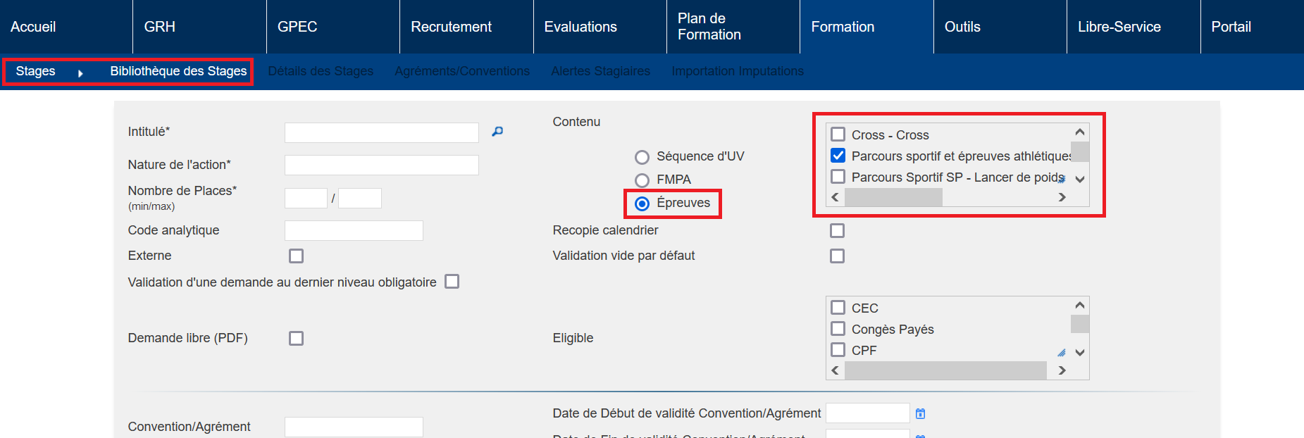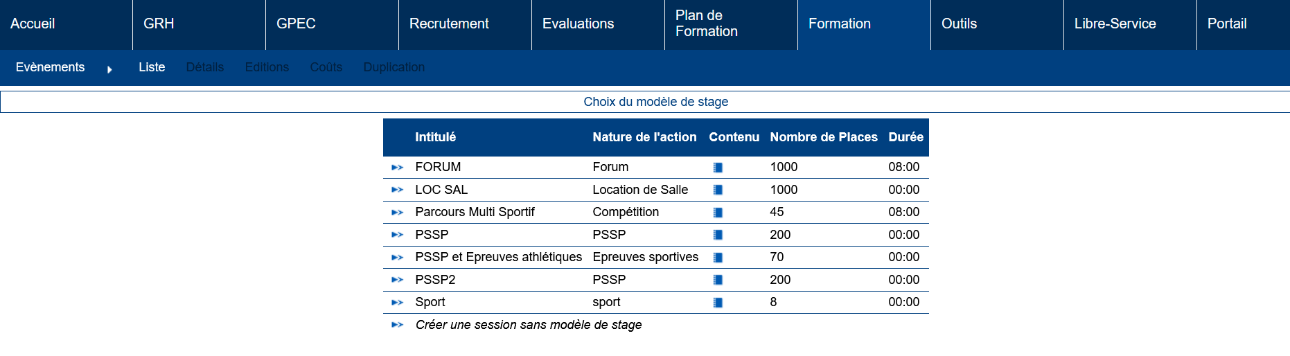 Si la variable est à “NON” les modèles d’évènement et les évènement peuvent être créés via les écrans “Formation > Stages > Bibliothèque des Stages” et “Formation > Sessions > Liste des sessions” ou via les écrans “Formation > Modèles d’évènements > Liste” et “Formation > Evènements > Liste” Dans ce cas, la création des stages et des modèles d’évènement est “fusionnée” et se distingue par le contenu : il est possible d’ajouter un contenu de type “épreuve”, paramétré au préalable.