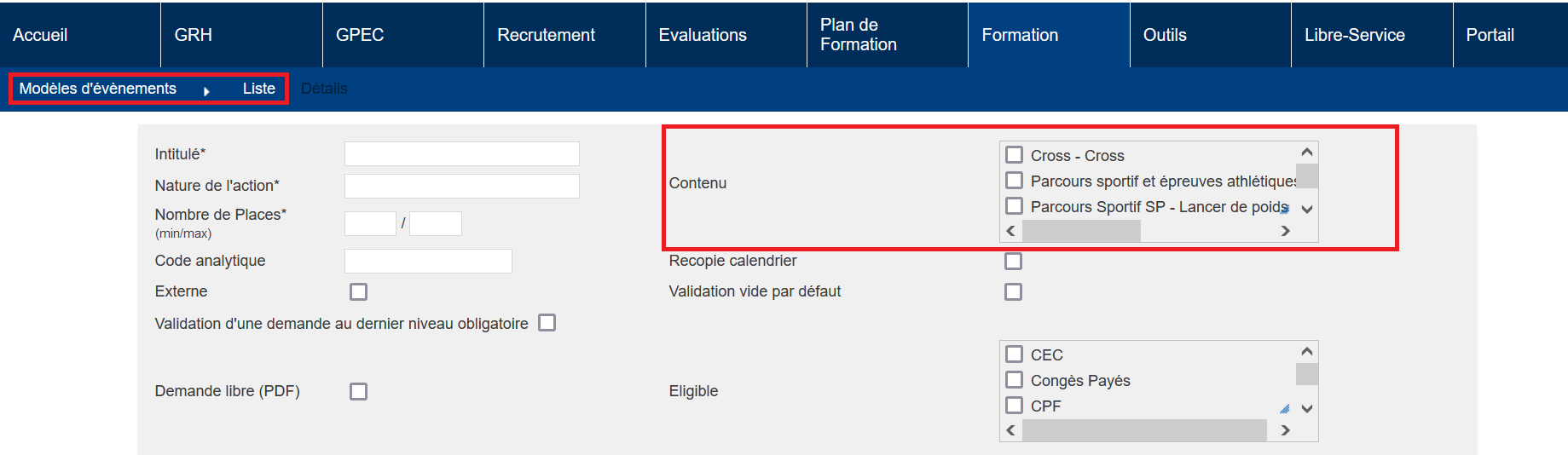 Si la variable est à “OUI” les modèles d’évènement et les évènement doivent être créés via les écrans “Formation > Modèles d’évènements > Liste” et “Formation > Evènements > liste”. Dans ce cas, seul le contenu de type “épreuve” est disponible.