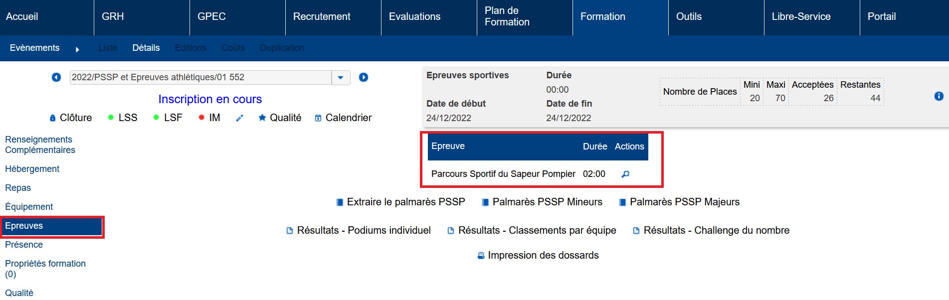 Dans l’écran, les différentes épreuves associées à la discipline définie comme contenu sont visibles.
