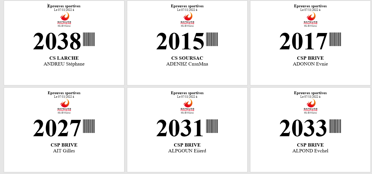 Le bouton “Impression des dossards” permet de générer un document Word abec une page par dossard (les numéros sont attribués aux agents automatiquement). Les agents sont classés par centre d’affectation.