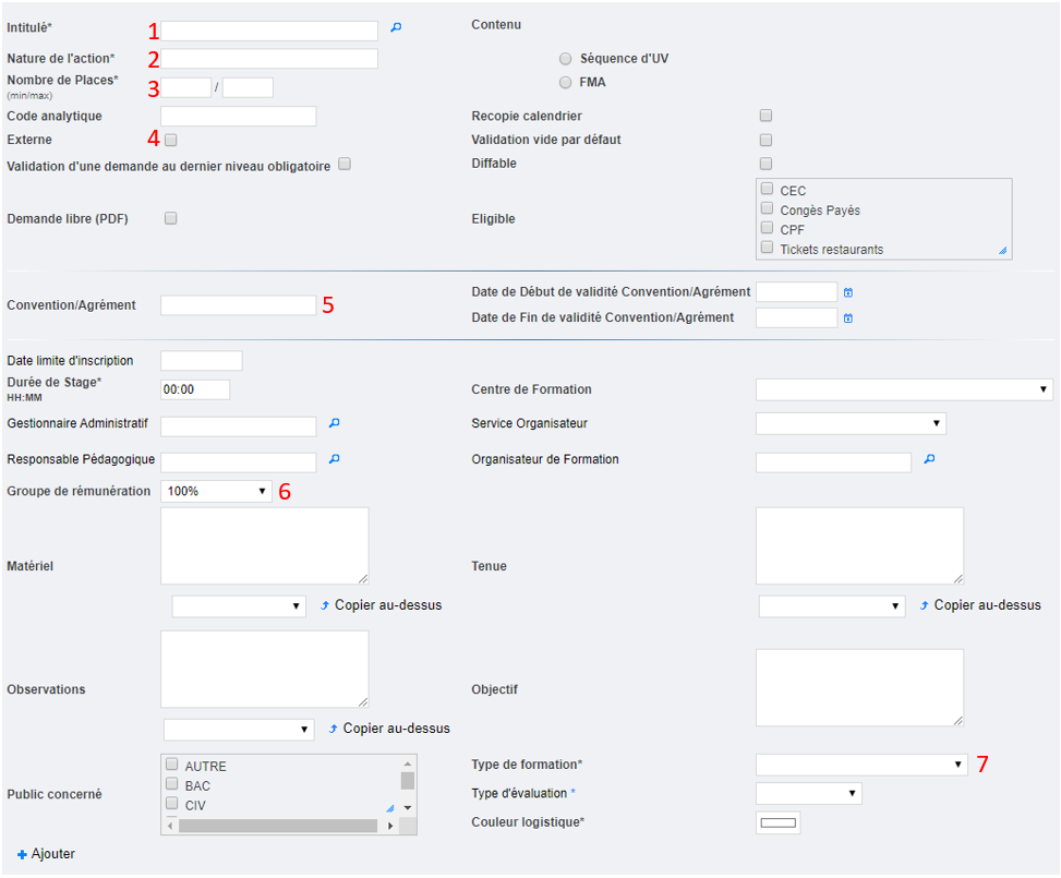 Type de formation : Classifié par famille, sous-famille et type de formation (« Administration > Types de Formations »). Seuls les intitulés accolés d’une « * » doivent obligatoirement être complétés. Liste exhaustive des champs :
