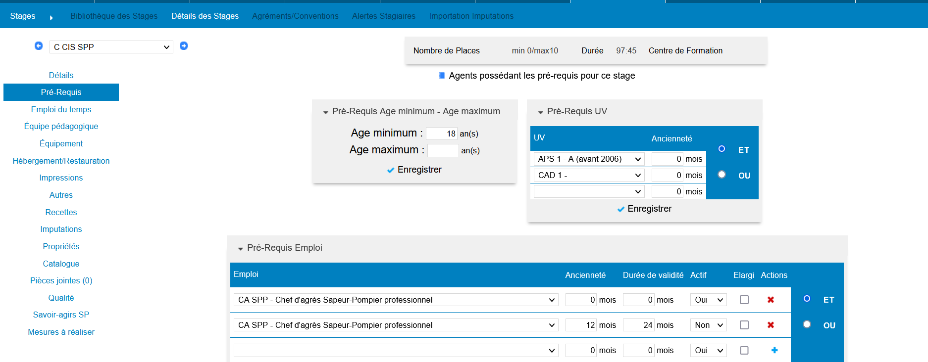 Les blocs sont cumulatifs entre eux (ET), tandis que à l’intérieur de chaque bloc les intitulés sont supplétifs (OU) – à l’exception du bloc « prérequis UV » qui est au choix et du bloc « âge mini – maxi » qui est cumulatif. Exemple : pour cette formation, l’agent doit être âgé au minimum de 18 ans, et doit avoir obtenu, à la fois l’APS 1 et le CAD 1 (cf. image ci-dessous) – pour les « prérequis UV », il est possible de choisir si les intitulés à l’intérieur du bloc sont cumulatifs ou supplétifs.