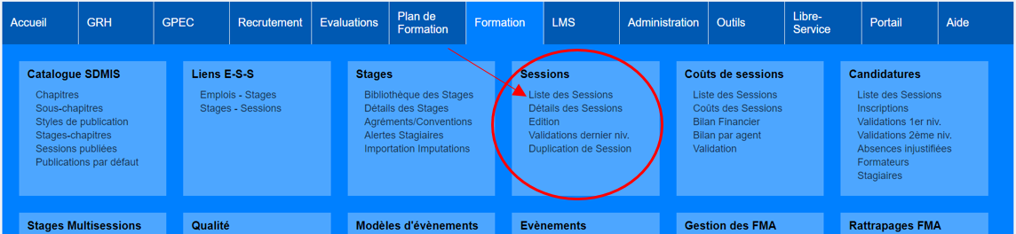 Formation > Sessions > Liste des sessions : Aperçu de toutes les sessions de stages existantes
