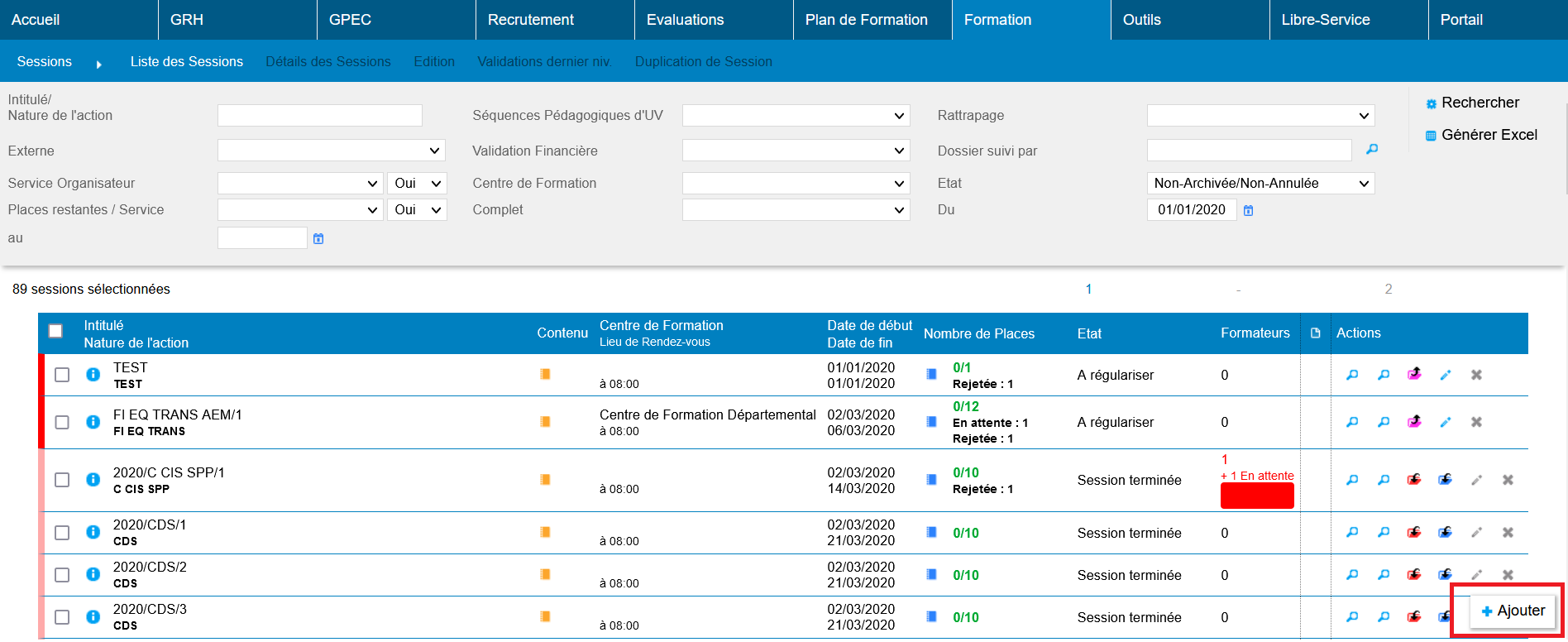 Afin de créer une nouvelle session, cliquer sur « Ajouter », se trouvant en bas de page