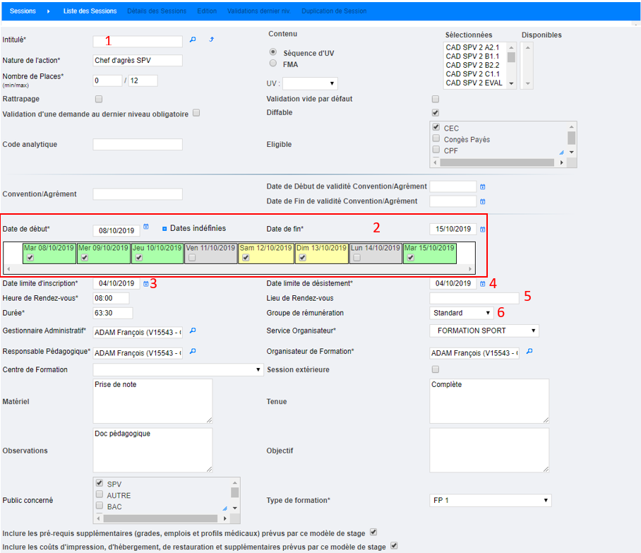 Dates de début et de fin : principe de « segmentation » disponible, permettant d’indiquer uniquement les jours de formations. (Exemple : uniquement les samedis). Les feuilles de présences seront calquées sur ces journées. Possibilité de cocher, lorsqu’ils ne connaissent pas encore les dates de la session.