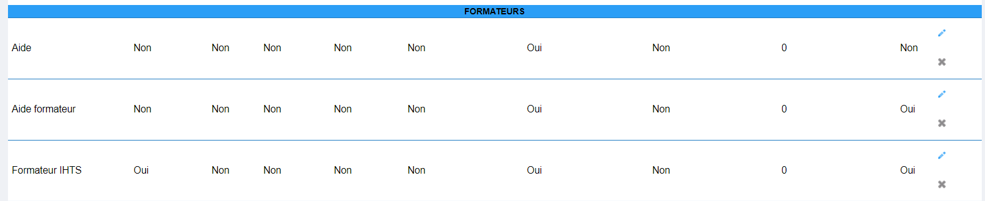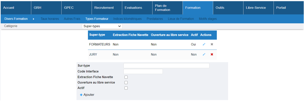 Sur cet écran, on peut voir les super-types précédemment créés, ainsi que les types de formateurs qui leur sont associés.