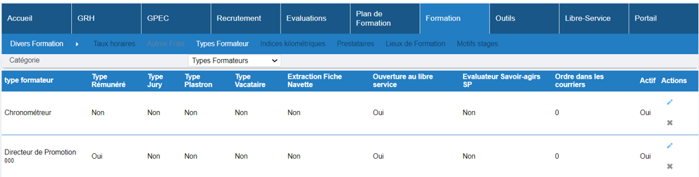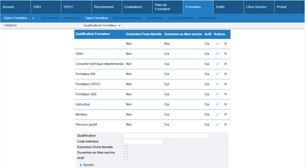 La création de ces éléments s’effectue dans l’écran « Formation > Administration > Divers Formation > Types formateurs »