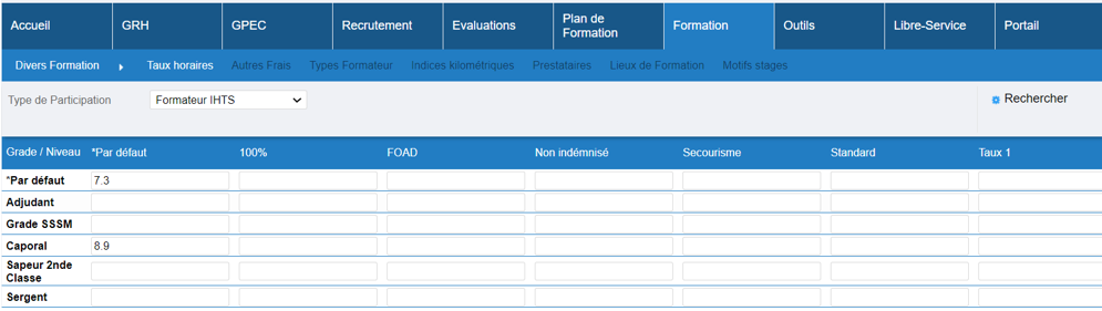 Les taux sont à définir par grade. En l’absence de taux pour un grade, c’est celui renseigné dans la case « *Par défaut » qui sera utilisé pour calculer l’indemnisation.