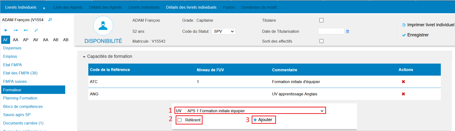 Ou via GRH > Livret individuel > Détails des livrets individuels > Formateur > Capacités de formation :