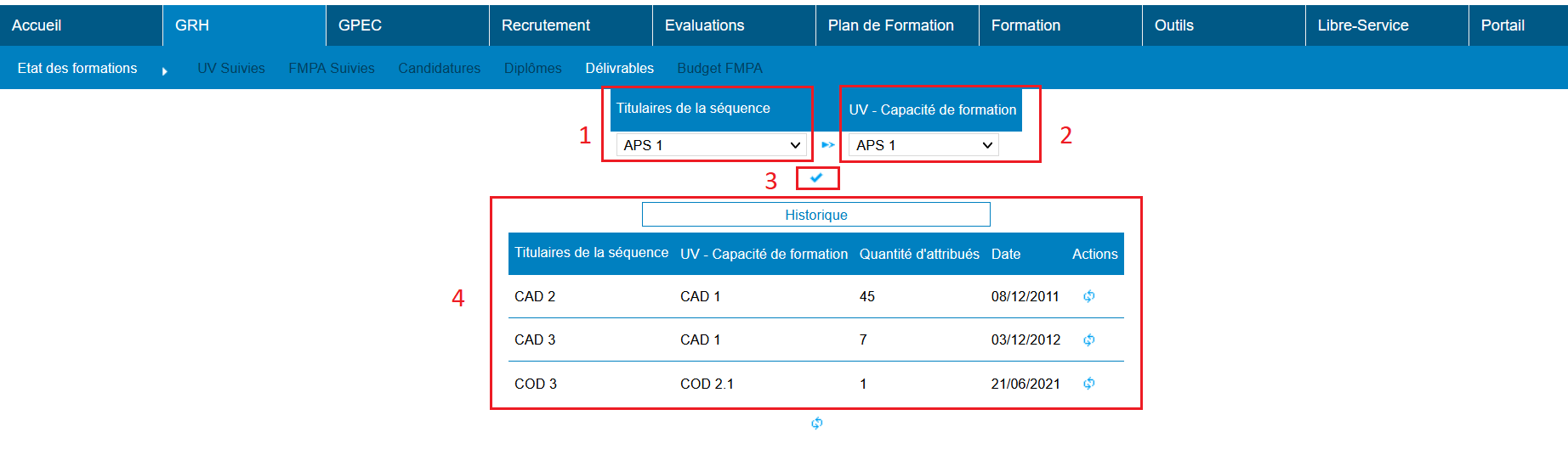- Capacité de formation : sélectionner la capacité de formation à attribuer (le code à sélectionner est une concaténation du Code de la référence et du niveau de l’UV) (2)