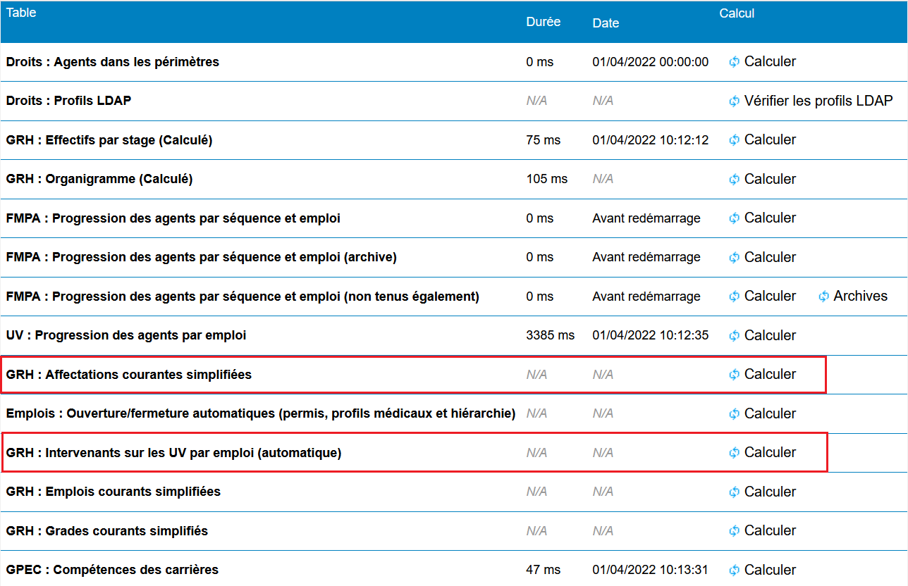 - Faire la mise à jour “Outils > Optimisation BD”, bouton “Calculer” sur la ligne “GRH : Emplois courants simplifiés”, ou “Calculer” sur la ligne “GRH : Intervenants sur les UV par emploi (automatique)” si vous êtes sur une base Oracle et que vous n’avez donc pas accès au premier bouton de calcul.