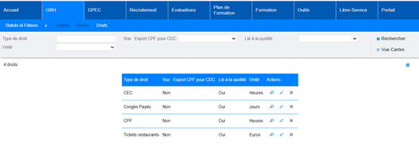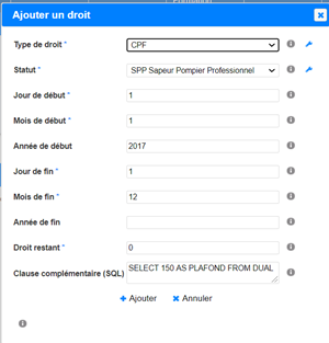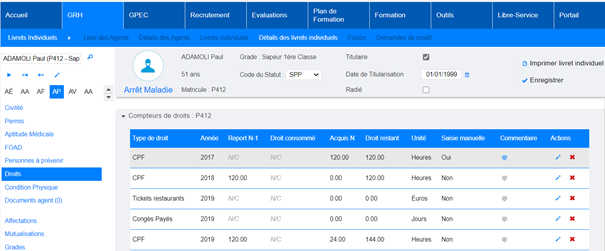 Le dispositif présenté dans cette version est prévu pour le suivi, à minima, du CPF et du CEC. Il pourrait convenir à d’autres types de droits (congés payés, RTT, congés parentaux, …) mais ceux-ci ne tiendraient pas compte des données de consommations hors formation (congés posés) sauf activation du module « Gestion du temps de travail » (contractualisation pour une licence complémentaire nécessaire). Cependant, il n’est pas exclu de paramétrer d’autres dispositifs en fonction des besoins du SDIS, cela peut par exemple être un outil pour décompter de manière individuelle les tickets restaurants consommés (en jours) par l’agent (PATS ou SPP) lors d’une formation