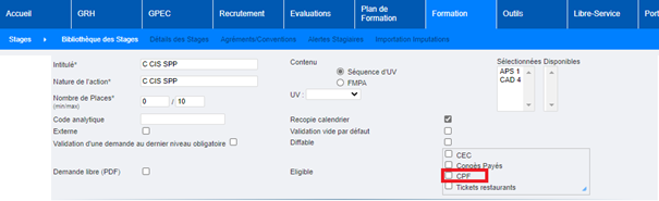 Une fois le droit créé, les stages et sessions peuvent être marqués « éligibles » à ce droit :