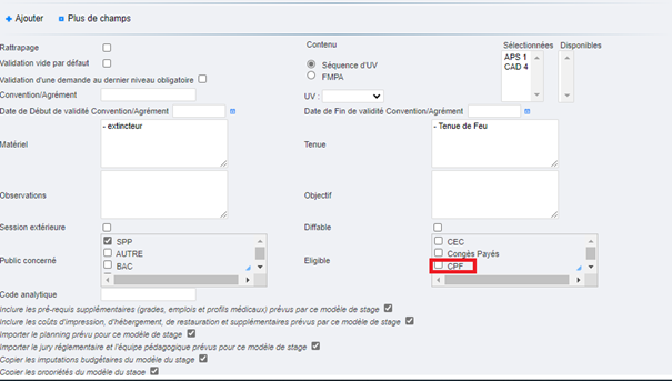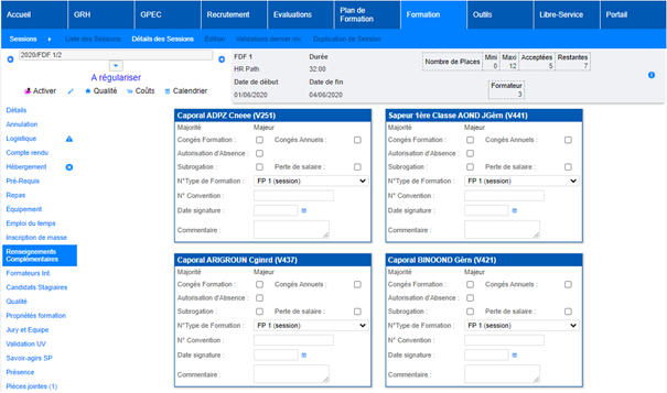 Au niveau hiérarchique (chef de centre, de service ou de groupement, selon sécurité applicative) et au niveau du gestionnaire de la session, les mêmes cases à cocher apparaissent en fonction du statut de l’agent et de l’éligibilité de la formation au dispositif :