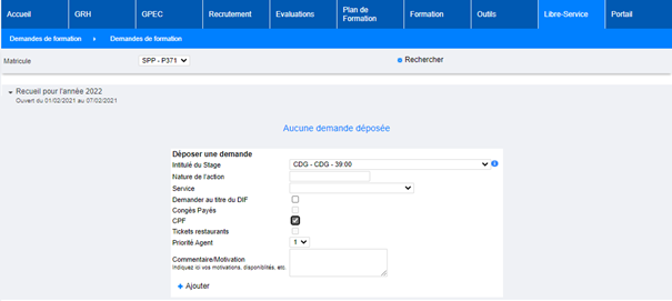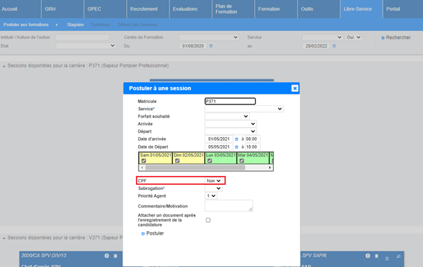 Lorsque l’agent postule via son libre-service, si le paramètre « Libre-service – DIF » (« Outils > Paramètres > Paramètres ») est sur la valeur « OUI » et que la session et le statut de l’agent le permettent, il peut préciser au titre de quel droit il demande la formation :