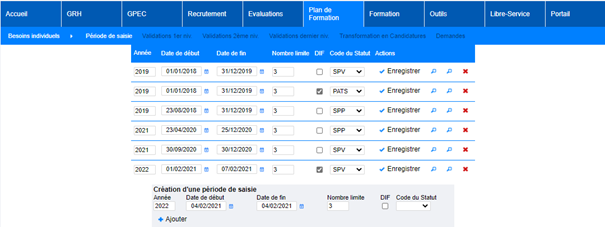 Pour le recueil des besoins individuels du plan de formation, dès lors que la période de saisie ouverte est marquée « DIF », et si le stage et son statut le permettent, l’agent peut créer des demandes au titre d’un dispositif :
