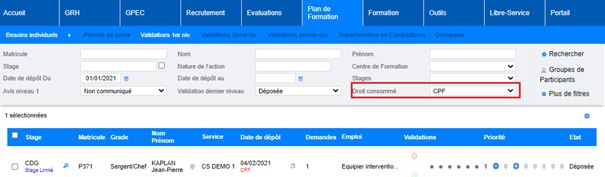 Comme pour le DIF, une zone « droit consommé » permet d’indiquer la quantité de droit consommé par la formation.