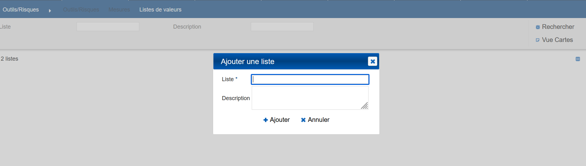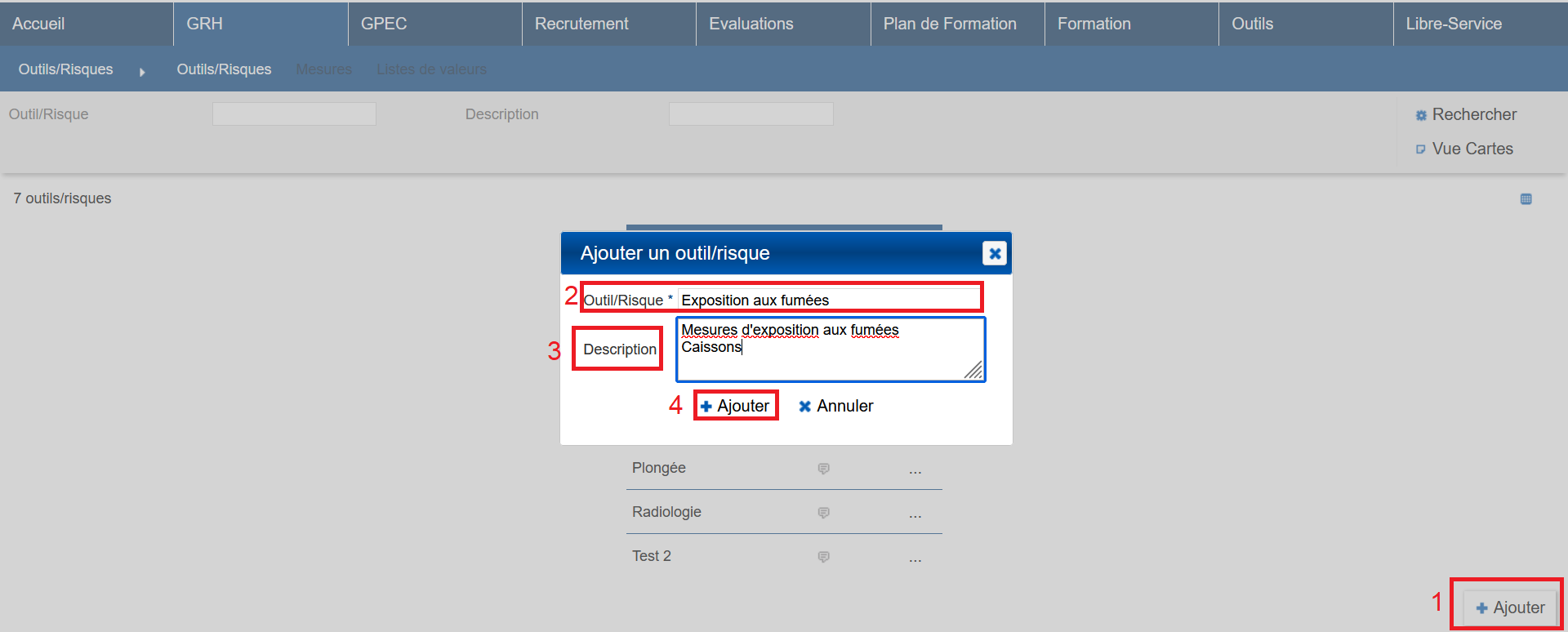 - Cliquer sur “Ajouter” en bas à droite de l’écran afin de créer un nouvel Outils/Risques (1).