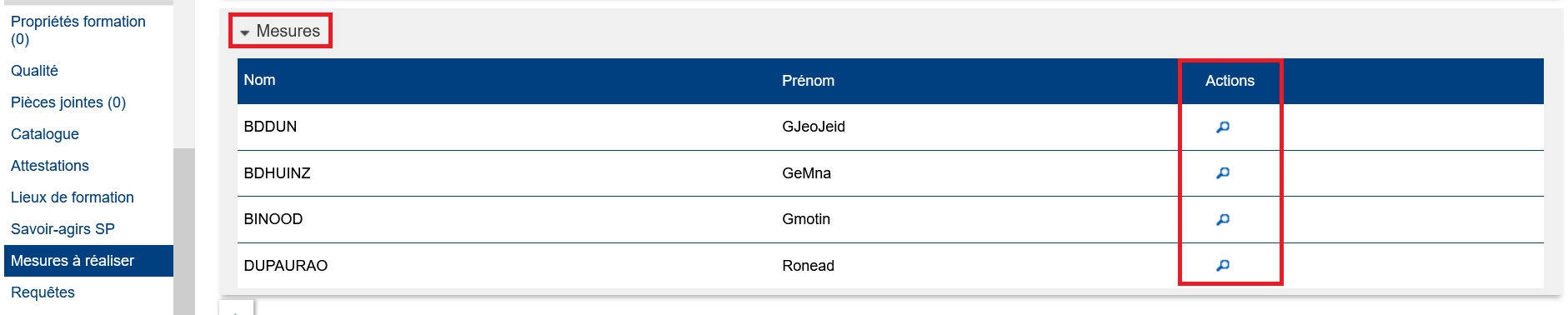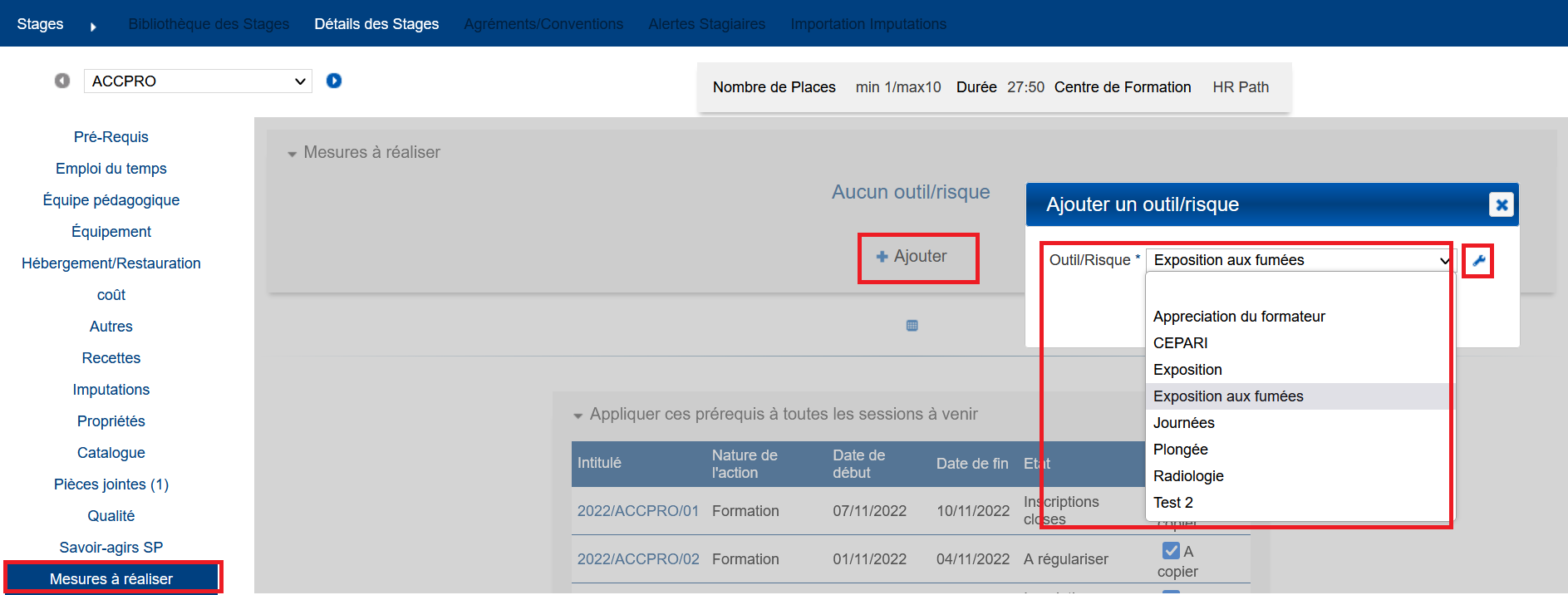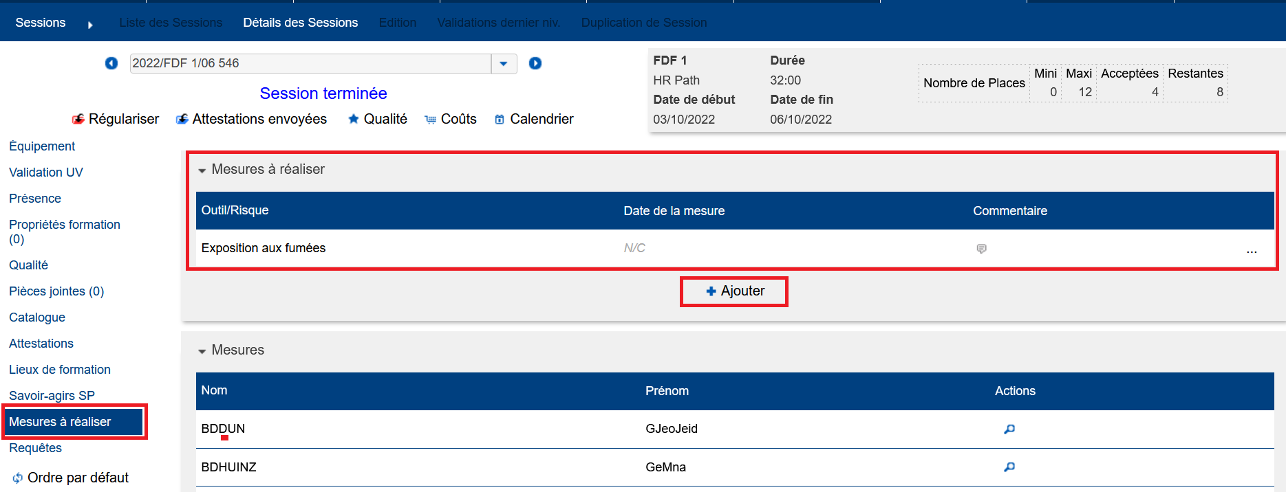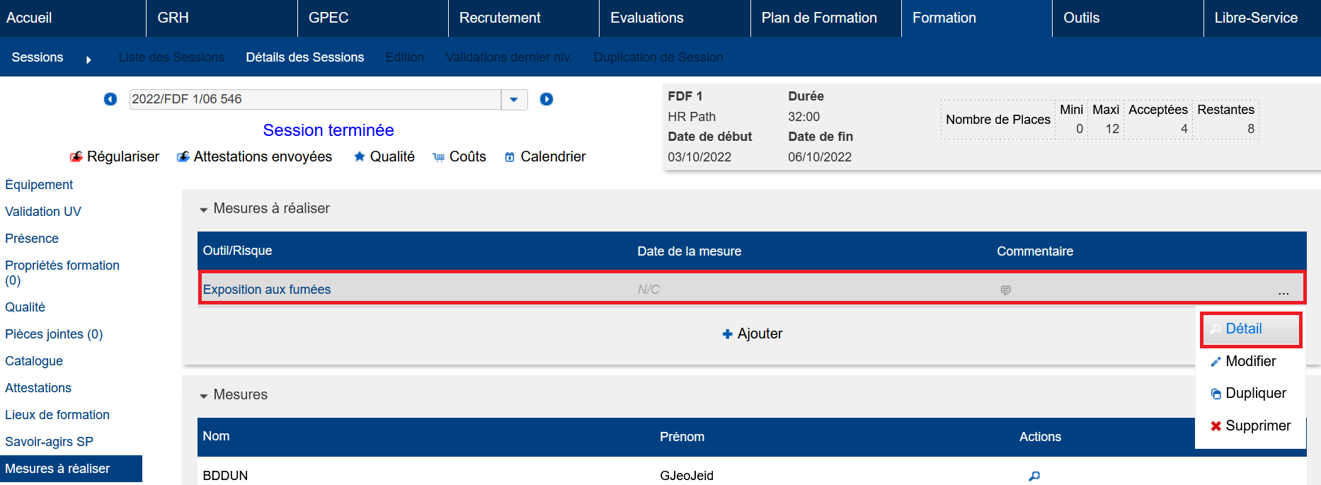 Les mesures outils / risques sont visibles dans l’écran “Formation > Sessions > Détails des sessions > Mesures à réaliser”.