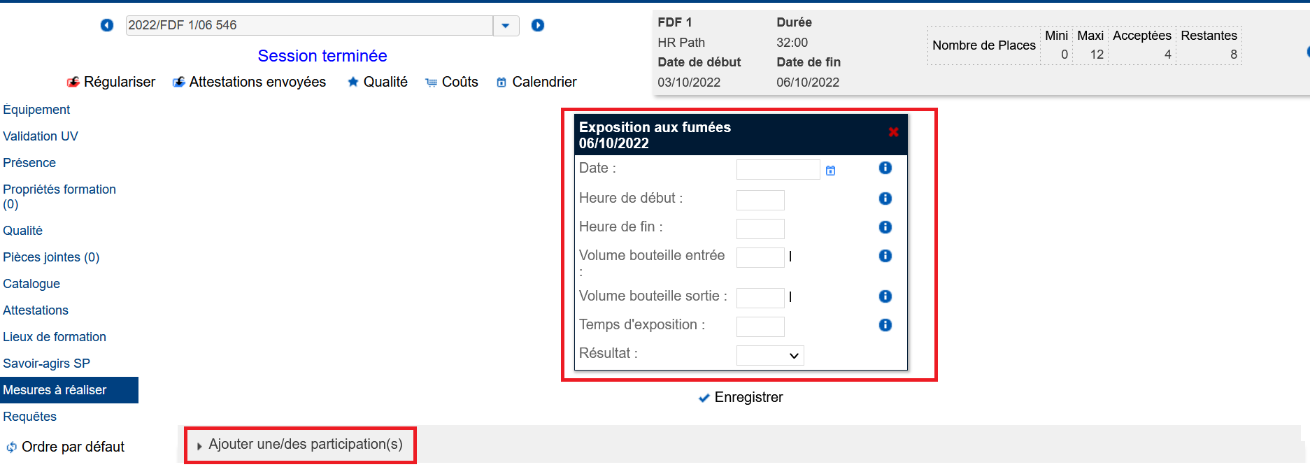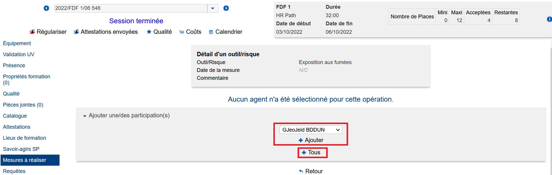 Attention : Pour saisir une mesure outils / risques pour un agent dans une session de stage, la session doit être au stade “Terminée”.