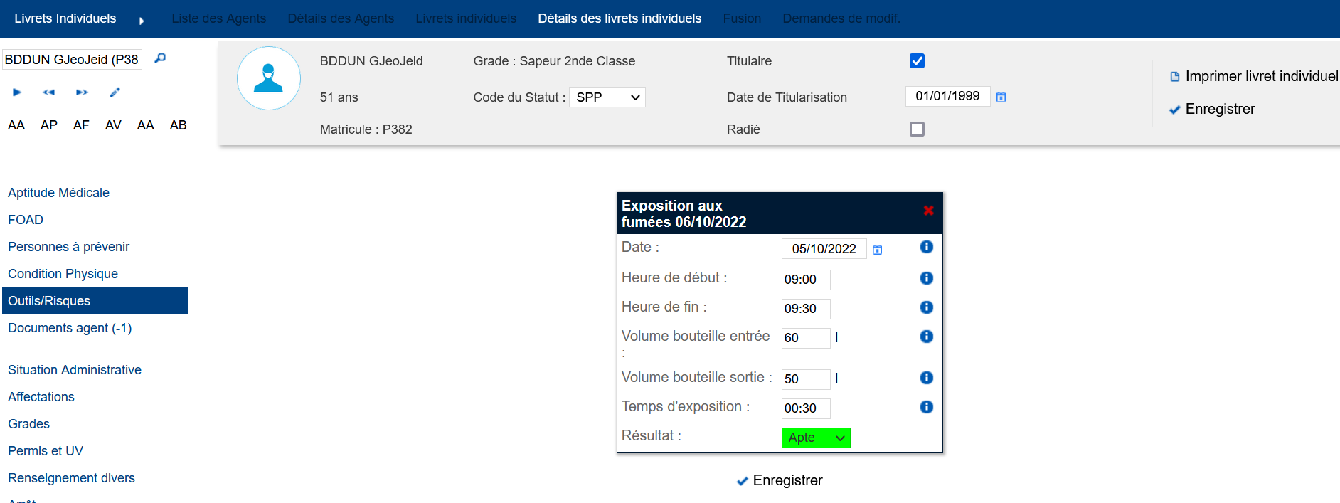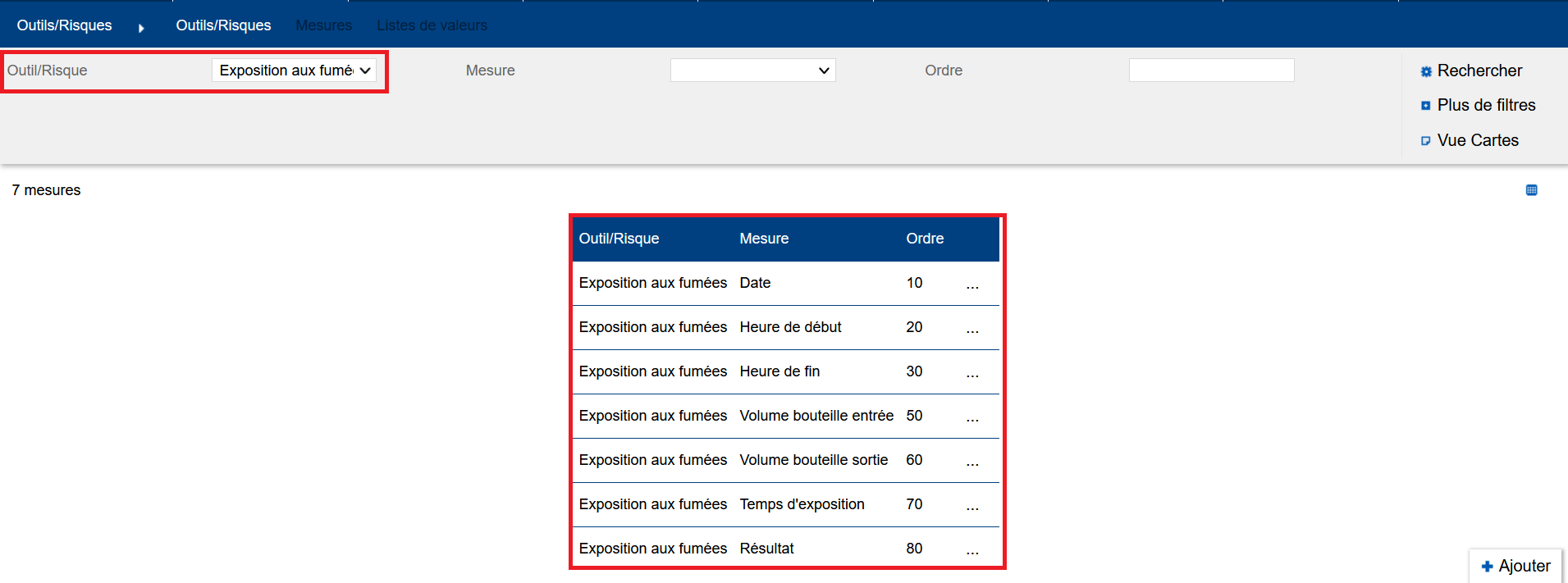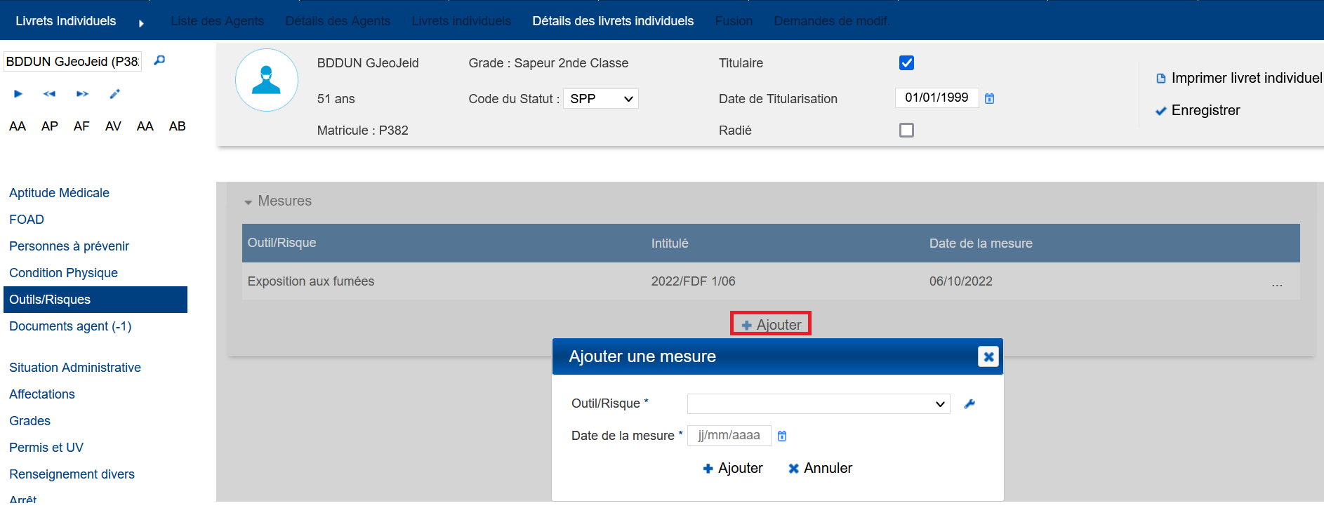 La gestion des Outils/risques permet la création de mesures dans le but d’effectuer un suivi de l’exposition à un risque. Ainsi, le temps passé sur un outil et le temps d’exposition à un risque peuvent être paramétrés dans les stages afin d’être renseignés lors d’une session, ou être saisis directement dans le Livret Individuel d’un agent.