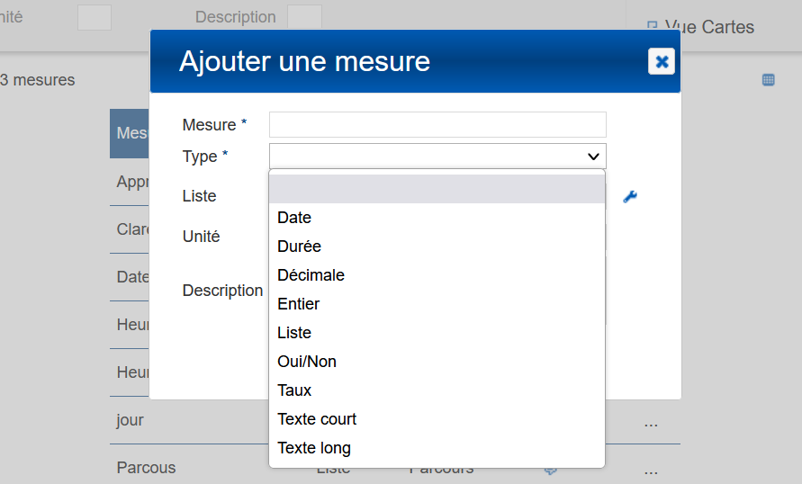 - Description : description de la mesure qui sera visible via une infobulle dans l’écran de saisi (Livret individuel de l’agent ou détail d’une session).