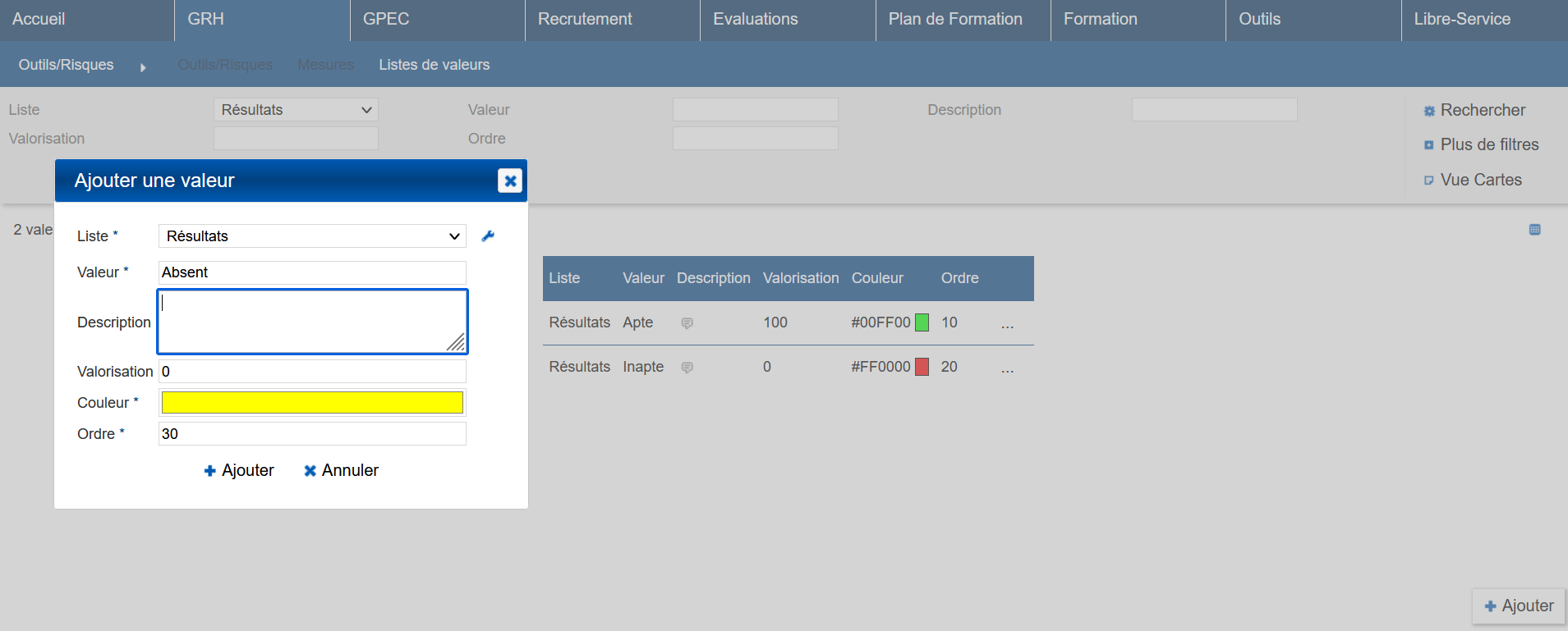 GRH > Administration > Outils/Risques > Outils/Risques :