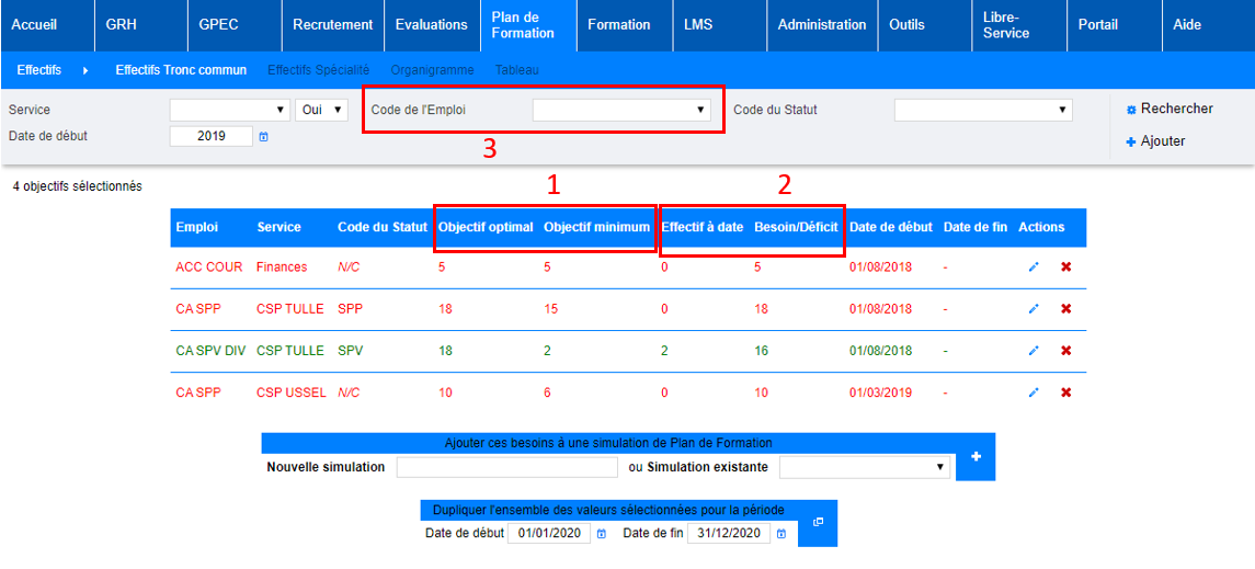 - Le calcul des effectifs à date sera affiché automatiquement, et il permettra donc le calcul automatique des besoins en effectif à former afin d’atteindre l’objectif optimal. Marquage rouge : l’effectif à date est inférieur à l’objectif minimum Marquage vert : l’effectif à date est supérieur ou égal à l’objectif optimal