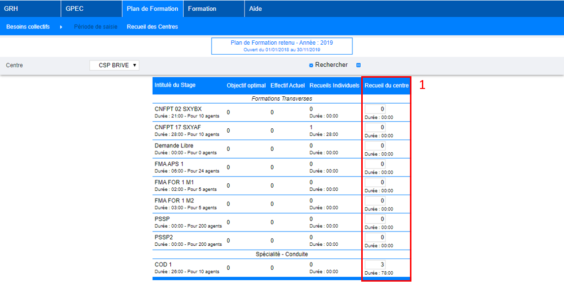 - Le chef de centre doit venir indiquer le nombre de places qu’il souhaite voir attribuer pour chaque stage, en fonction des besoins optimaux indiqué sur la première colonne, de l’effectif actuel (2e colonne), ainsi que des recueils individuels, soit le nombre d’agents ayant demandé chaque stage (3e colonne).