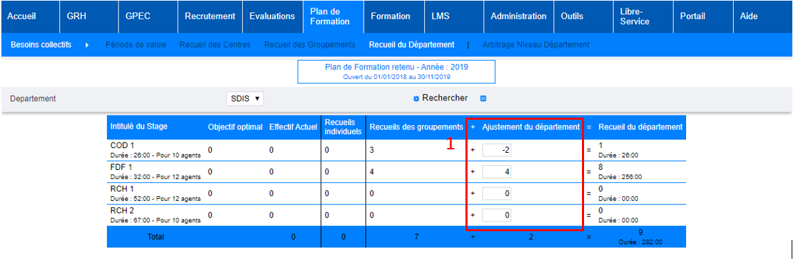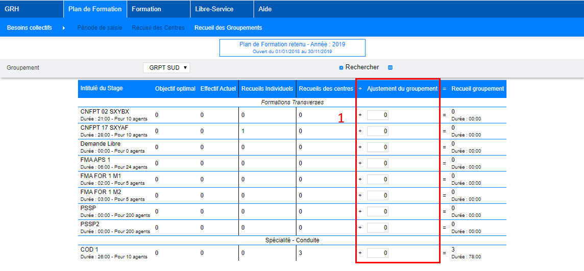 - Le groupement territorial va ajouter la variable d’ajustement pour chaque stage en fonction de la demande du chef de centre. S’il souhaite diminuer le nombre de stagiaires, il va falloir indiquer un « - » devant le chiffre. En effet, Recueil des centres + Ajustement du groupement = Recueil groupement.