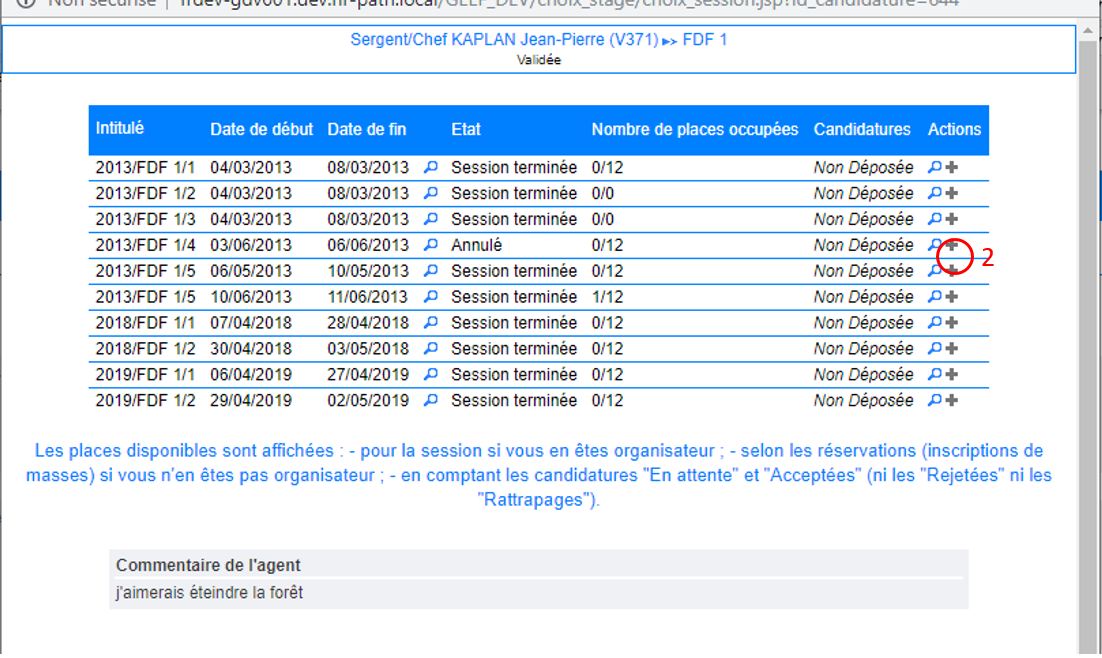 - Cliquer sur « + » afin d’inscrire l’agent sur la session de stage demandée.