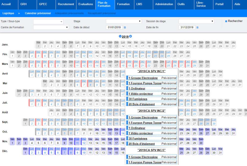 En plaçant le curseur sur une date du calendrier, la liste des moyens logistiques à prévoir sera affichée.