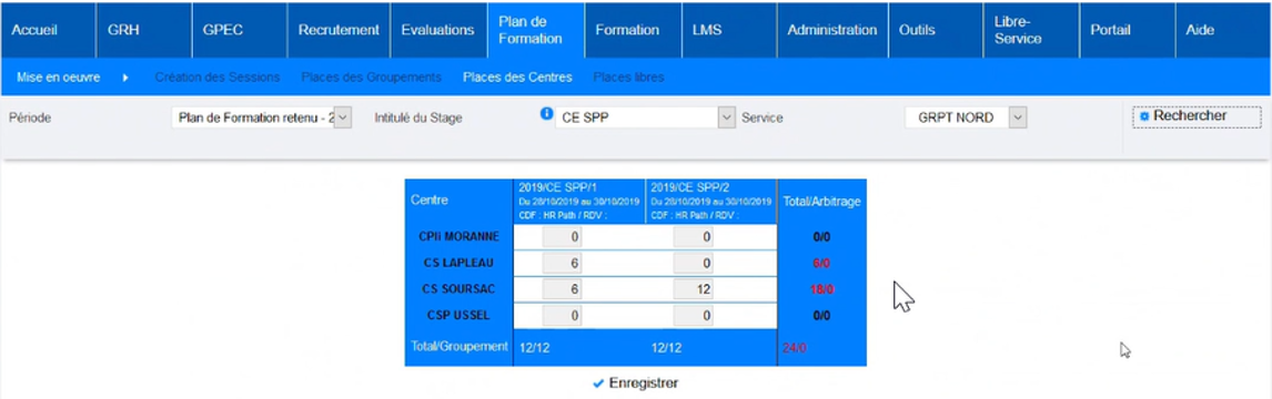 Suite à la répartition au niveau des groupements, il va maintenant être possible de répartir les places au niveau des centres via l’écran.