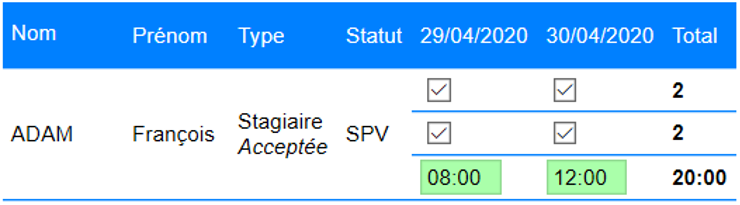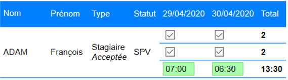 Le stagiaire François ADAM arrive à 9H00 le premier jour et repart à 16H00 le deuxième :