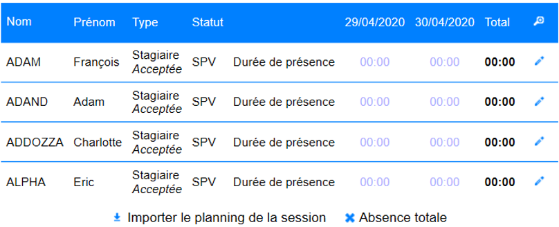 Pour enregistrer les présences de l’agent, il est possible d’importer le planning de la session :