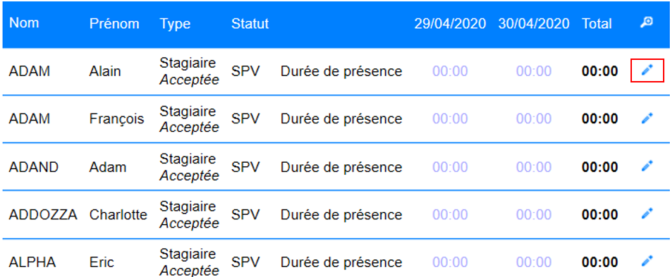 La saisie des présences par agent se fait en cliquant sur le bouton « modifier ».