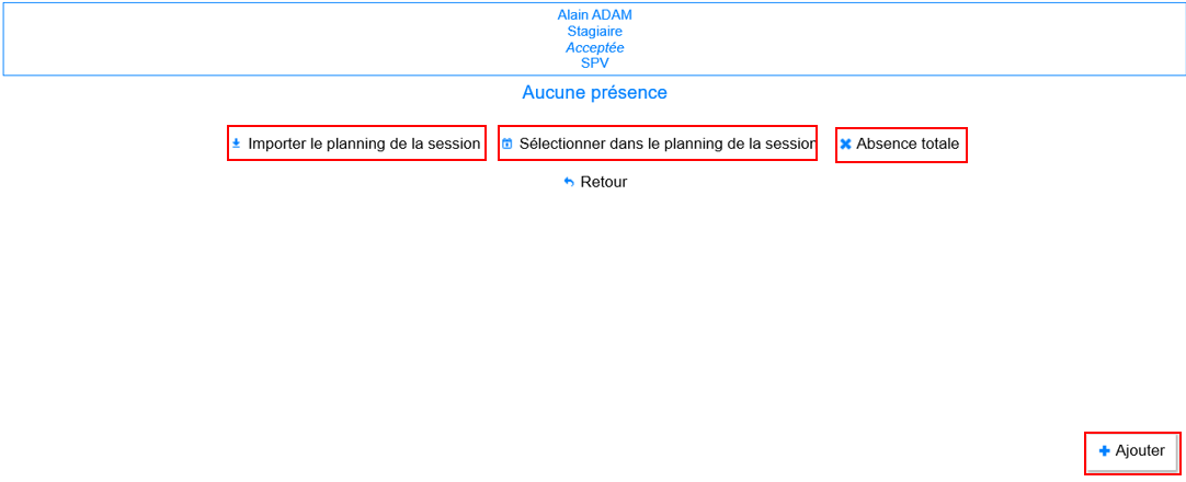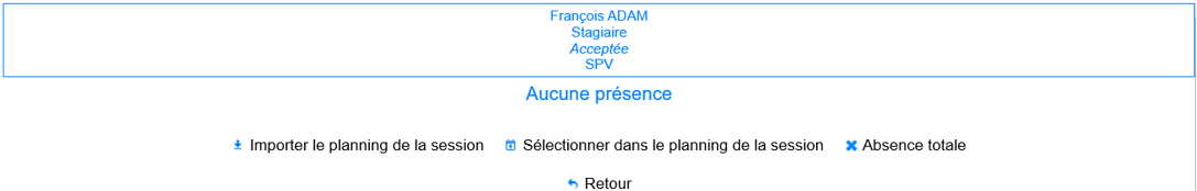 Absence totale : Créer des absences sur la totalité de la session. Ces absences sont en fait des présences qui n’ont pas d’heure de début ou de fin, et ont une durée égale à 0.