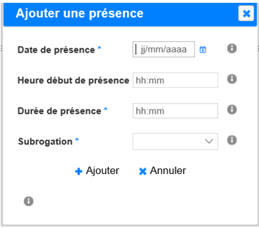 Ajouter : permet de renseigner une présence détaillée avec : • Date de présence • Heure de début de présence • Durée de présence • Subrogation