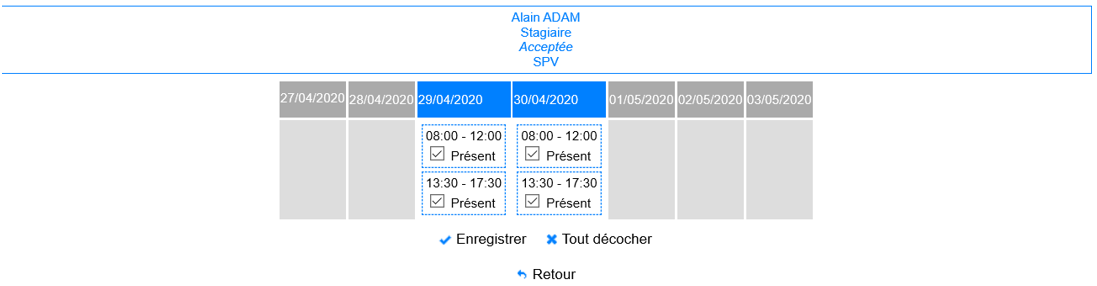 Il est possible de sélectionner uniquement des demi-journées, ou de déclarer les agents absents.