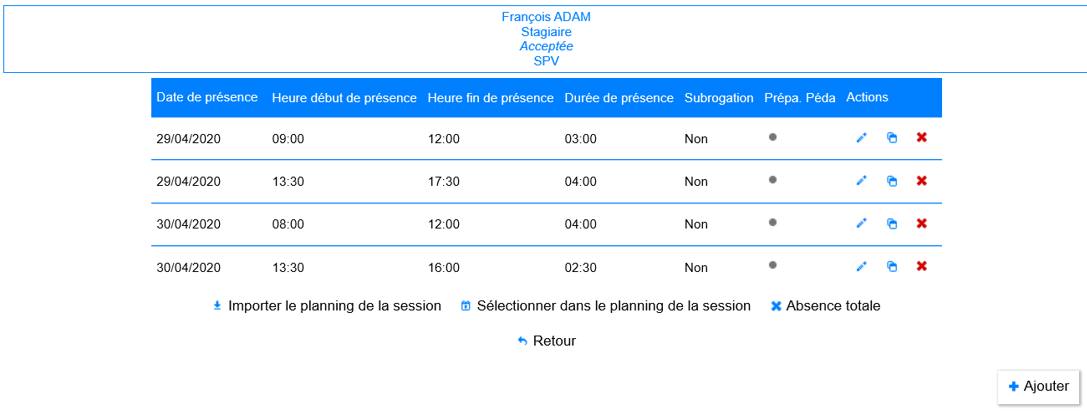 Importer le planning de la session: permet de créer les présences selon le planning défini dans la session, avec heure de début et fin de présence pour l’ensemble des stagiaires.